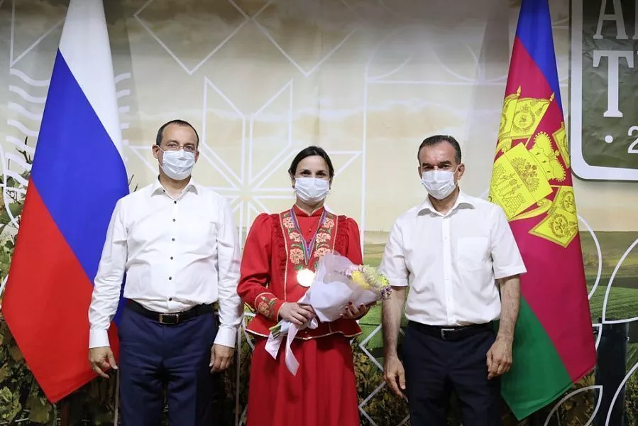 Вениамин Кондратьев и Юрий Бурлачко наградили участников краевой выставки-ярмарки. Благодарность губернатора была объявлена индивидуальному предпринимателю Аркадию Погорелову из Северского района за большой личный вклад в развитие туристской отрасли.