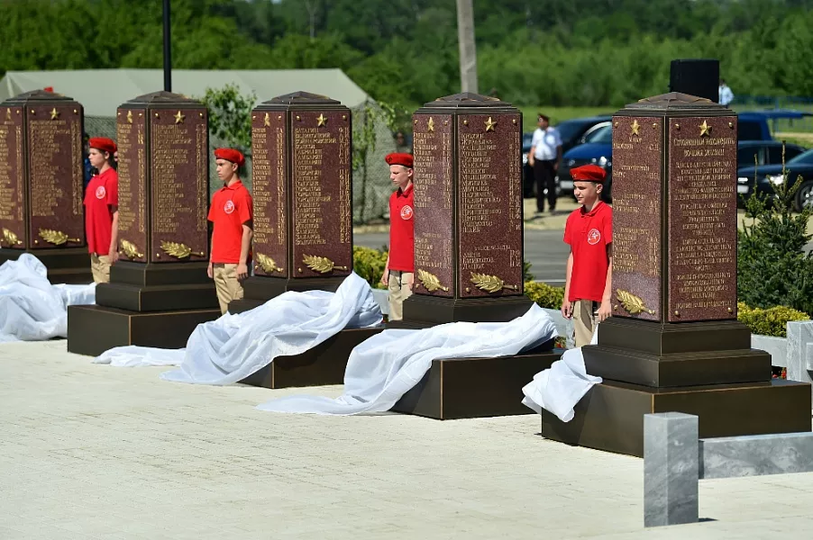 Почетные гости возложили цветы к главной стеле и почтили минутой молчания память погибших бойцов и мирных жителей. После траурной церемонии торжественным маршем прошли парадные расчеты Краснодарского территориального гарнизона.