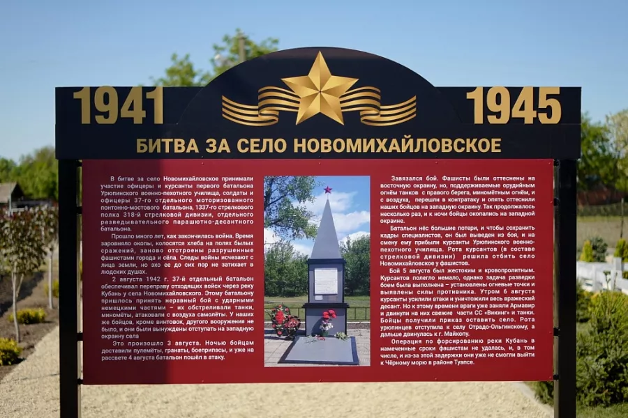 Вениамин Кондратьев подчеркнул, что этот мемориал – памятное место для жителей села Новомихайловское и всего края. В августе 1942 года здесь развернулись кровопролитные бои за переправу через Кубань. Немцы планировали быструю атаку, чтобы дальше наступать на Майкоп и Туапсе, но столкнулись с ожесточенным сопротивлением.