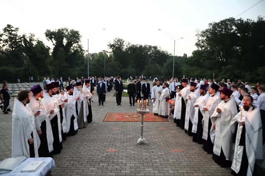 После траурного мероприятия прошло заупокойное богослужение в память о всех погибших в годы войны, которое провел Митрополит Екатеринодарский и Кубанский Григорий.
