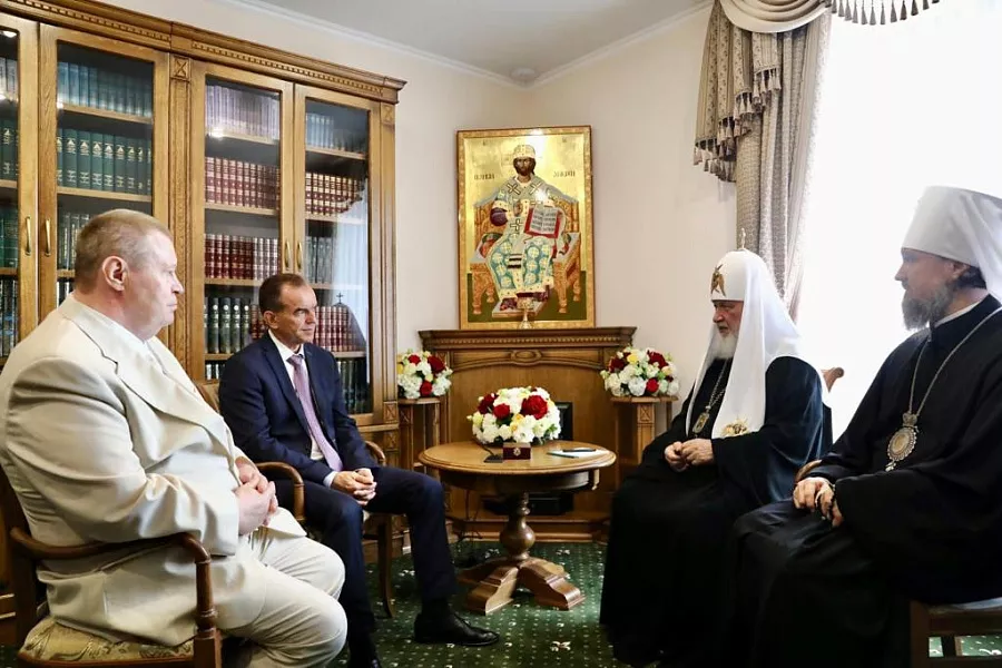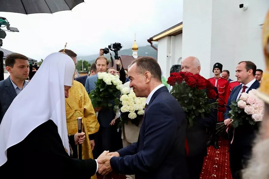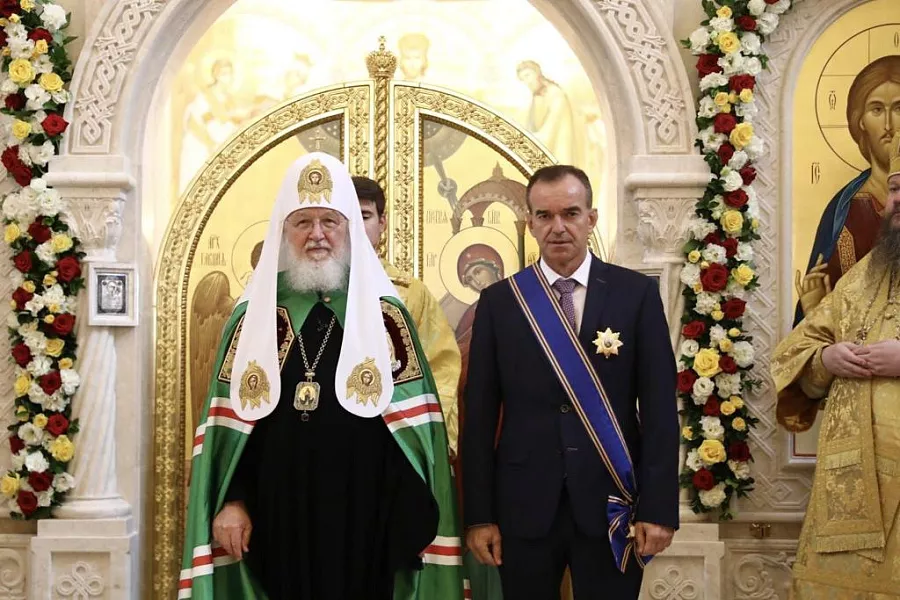 По завершению Божественной литургии Патриарх Московский и всея Руси вручил губернатору Вениамину Кондратьеву орден преподобного Андрея Иконописца 1 степени за внимание к помощи в строительстве собора в Геленджике.