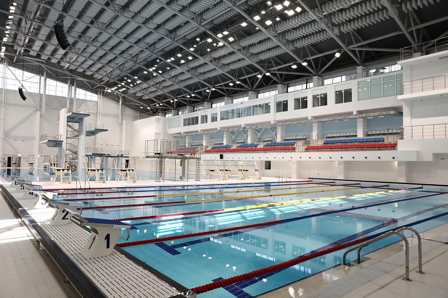 Объект площадью 38,4 тысячи квадратных метров ввели в эксплуатацию 20 июля. В состав дворца входят четыре чаши – олимпийская, тренировочная, для прыжков в воду, которую также можно задействовать для водного поло и синхронного плавания и детская. Здесь установили трибуны на три тысячи мест, открыли помещение для судей и прессы, конференц-зал и зону медицинского обслуживания, массажные комнаты.