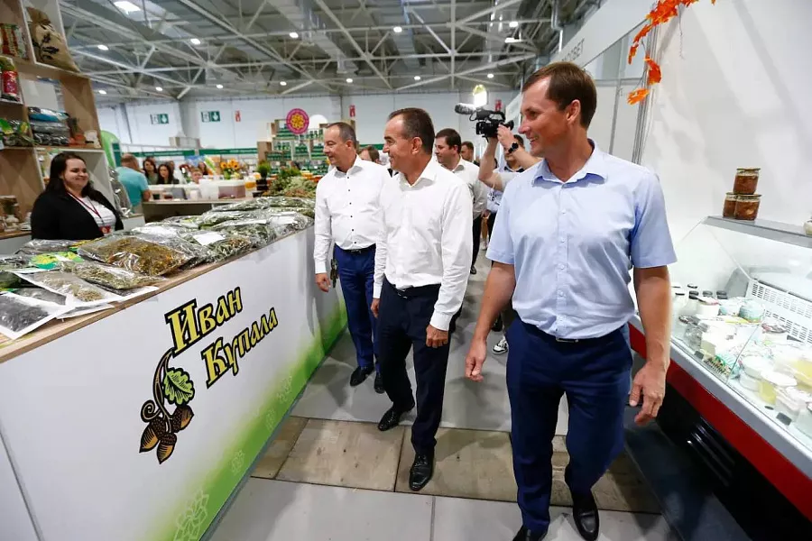 Губернатор Краснодарского края и спикер Законодательного Собрания Юрий Бурлачко познакомились с продукцией производителей края в павильонах выставочного комплекса «Экспоград-Юг».