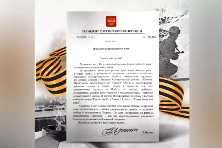 – На протяжении веков ваш родной край играл важную роль в судьбе страны, в развитии ее экономики, сельского хозяйства, укреплении государственности. Особые, героические страницы его истории связаны с Великой Отечественной войной. Оборона Малой земли, ожесточенные бои Красной Армии за освобождение кубанских городов и станиц, отвага и мужество тех, кто подвижнически трудился на Победу на заводах, фабриках и в госпиталях, снабжал фронт одеждой и продовольствием – навечно в памяти нашего народа. И потому Новороссийск по праву удостоен почетного звания «Город-герой», а Анапа и Туапсе – «Город воинской славы», –говорится в телеграмме Владимира Путина.