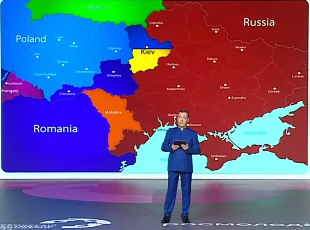 Медведев также заявил, что нынешнее украинское государство является губительным прежде всего для собственных граждан. В это время на большом экране за его спиной появилась карта.