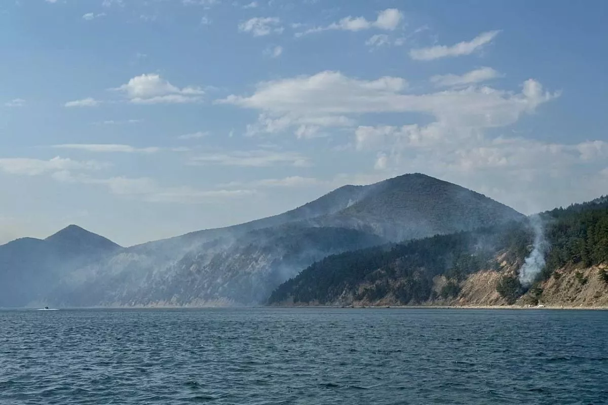 Туристы, заблокированные лесным пожаром, возникшем в Геленджике в результате ночной атаки БПЛА, доставлены на безопасный пляж в селе Криница.