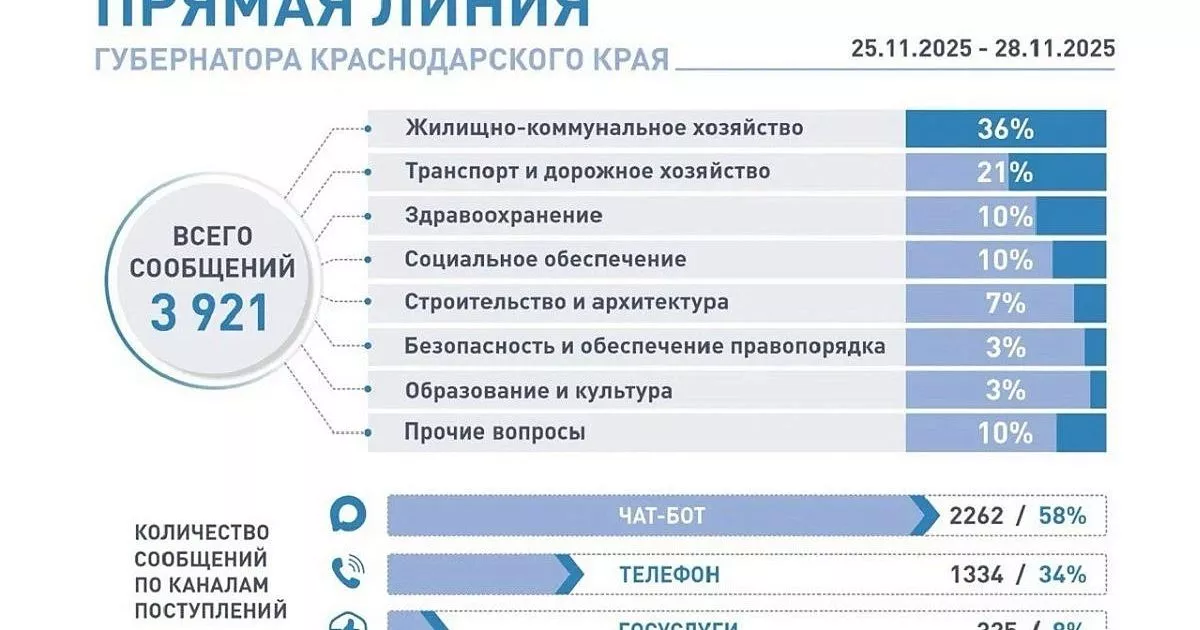 Столько сообщений поступило от жителей региона с 25 по 28 ноября. Чаще всего люди воспользовались для этого чат-ботом – 58%. Популярен и телефон – 34%, остальные 8% передали свои обращения через «Госуслуги».