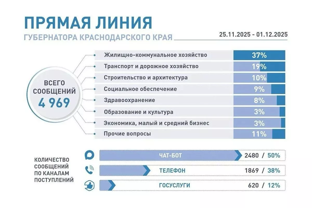 С 25 ноября по 1 декабря жители Краснодарского края направили 4969 обращений. Вопросы присылают чаще всего через чат-бот – 50%. По телефону центра обработки сообщений принято 38%, через портал «Госуслуги» – 12%.