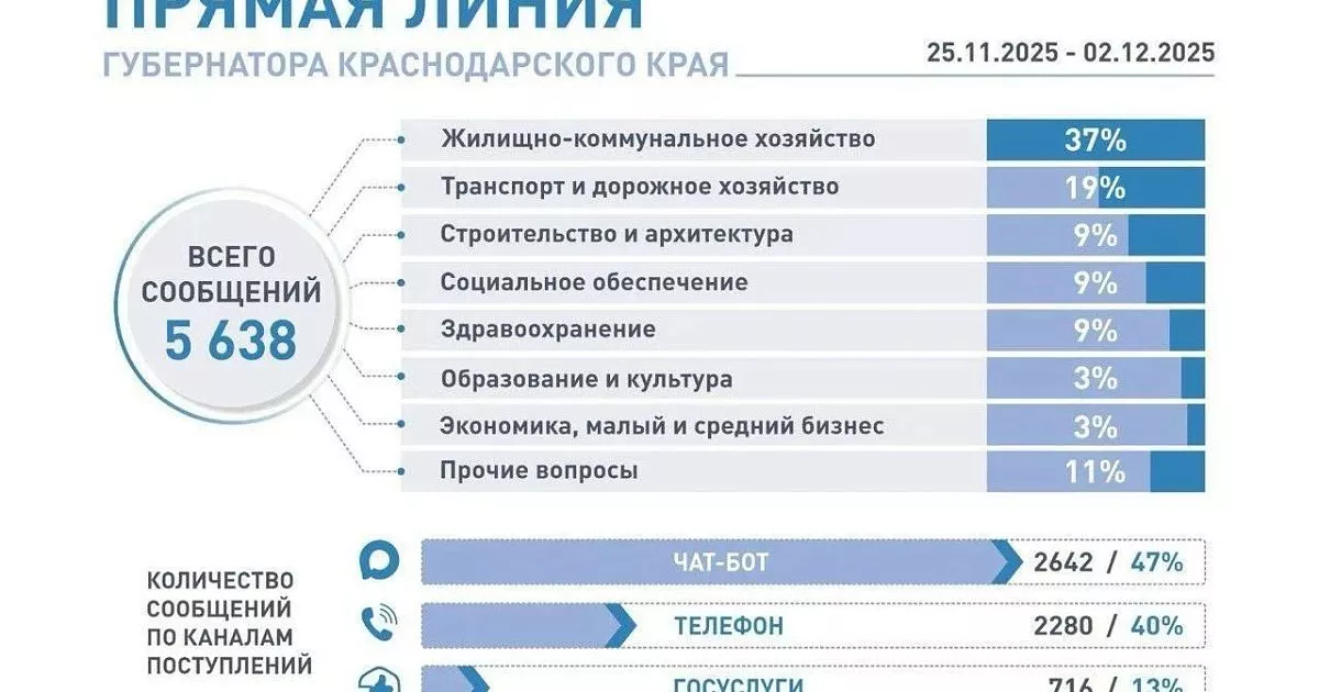 Более половины обращений на «Прямую линию» губернатора Кубани Вениамина Кондратьева касаются тем ЖКХ (37%), транспорта и дорожного хозяйства (19%). В списке популярных направлений также строительство и архитектура, социальное обеспечение и здравоохранение.