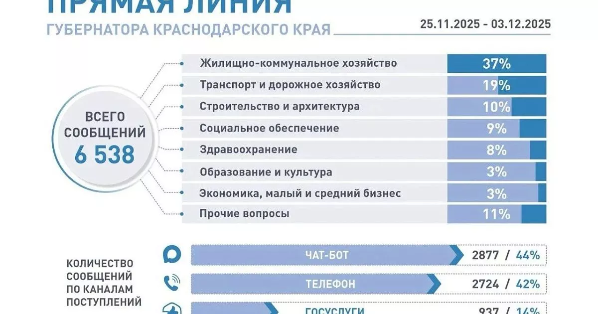 Топ-5 актуальных тем остается неизменным: жилищно-коммунальное и дорожное хозяйство, транспорт, строительство и архитектура, социальное обеспечение и здравоохранение. Им посвящено 83% всех поступивших сообщений.