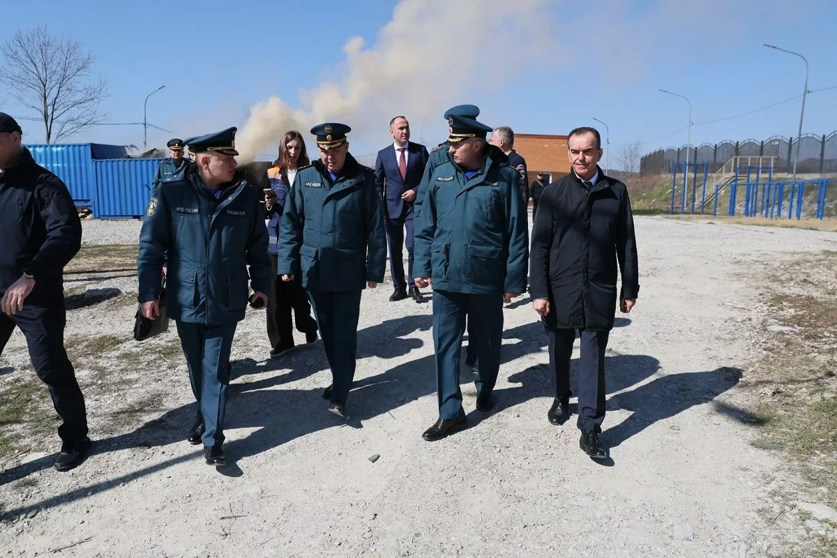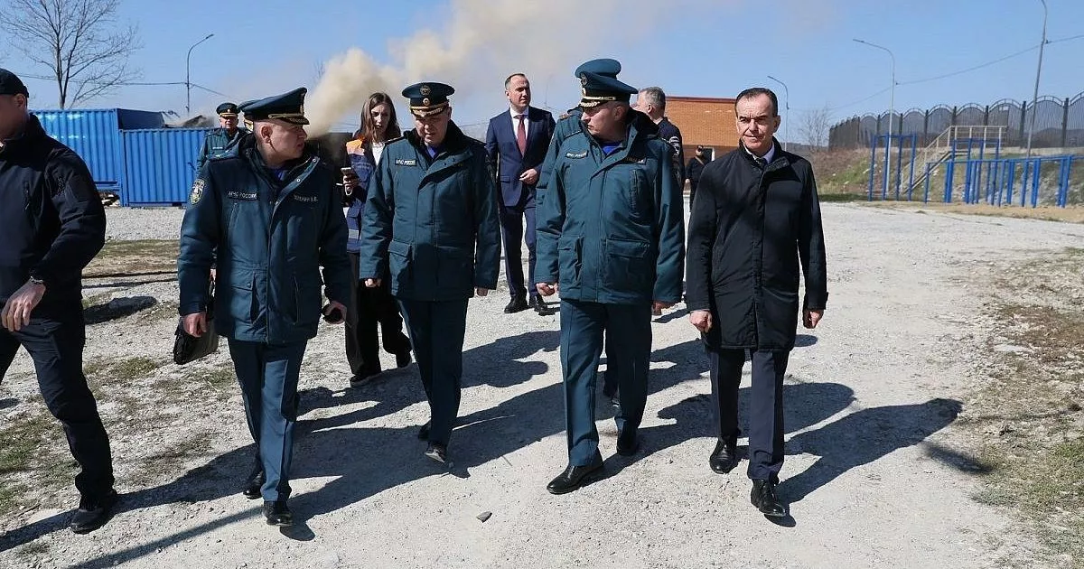 Глава МЧС России и губернатор Краснодарского края осмотрели тренировочные площадки, специализированные классы, помещения для проживания и дежурства, а также парк пожарной и спасательной техники, используемой в образовательном процессе.