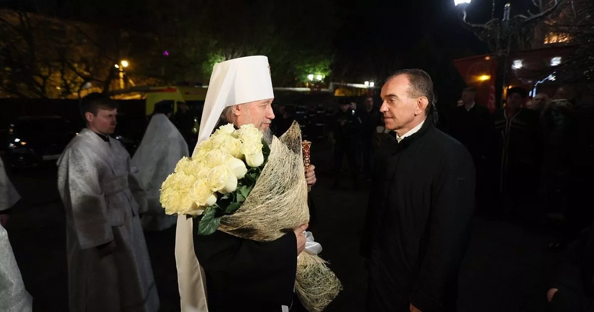 Перед началом службы губернатор поздравил митрополита с приближающейся Пасхой Христовой и подарил букет белых роз, сообщает пресс-служба краевой администрации.