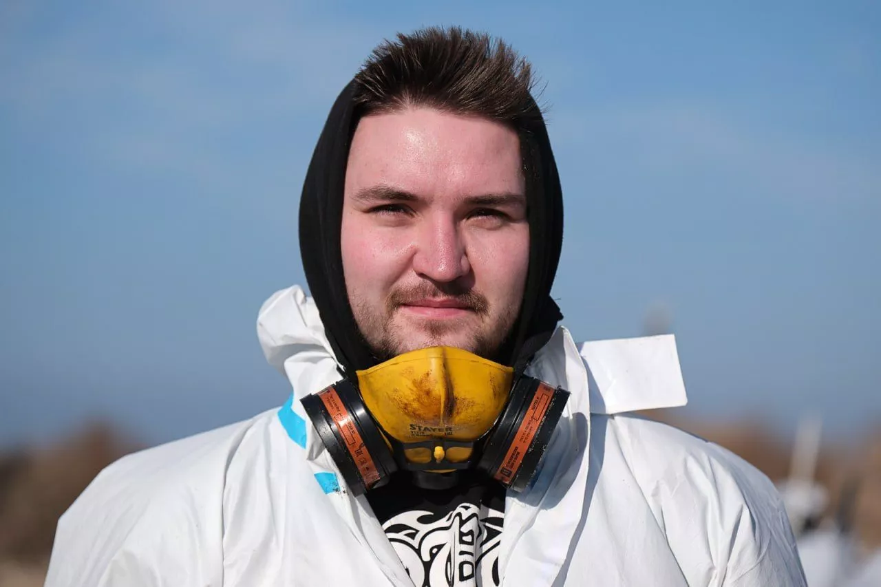 Трое друзей из Казани, в том числе и фотограф Никита Иванов, приехали к месту ликвидации последствий ЧС на десять дней, взяв отпуск на работе. Как рассказал Никита, волонтерской деятельностью он занимается уже не первый год. Поэтому не смог остаться в стороне, когда случилась авария с танкерами. На Бугазской косе друзья из Казани, как и другие участники ликвидации, работают с помощью мольберта: накидывают лопатами загрязненный песок на металлическую сетку. Остающиеся в лотке фрагменты мазута собирают в мешок.